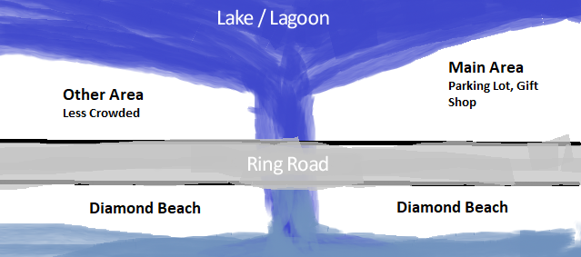 The area around the main parking lot is always crowded: Check out the layout drawing below. Most people stay within 60 m of the parking area. Just walk a little farther, and you’ll get away from the main crowds. About half mile down the road is another parking lot. From there you can go down the cliff to the beach. It’s significantly less busy here and most of the time you see as many icebergs.
